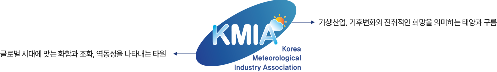 한국기상산업협회는 기상산업의 건전한 육성발전과 국제경쟁력을 강화하고자 하는 협회의 이념을 “타원과 구름, 태양” 으로 표현하여 영문 “KMIA”와 같이 나타낸 심볼입니다.