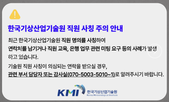 한국기상산업기술원 담당 직원이 아님 사람으로부터 연락을 받는 등 기술원 직원 사칭이 의심될 경우