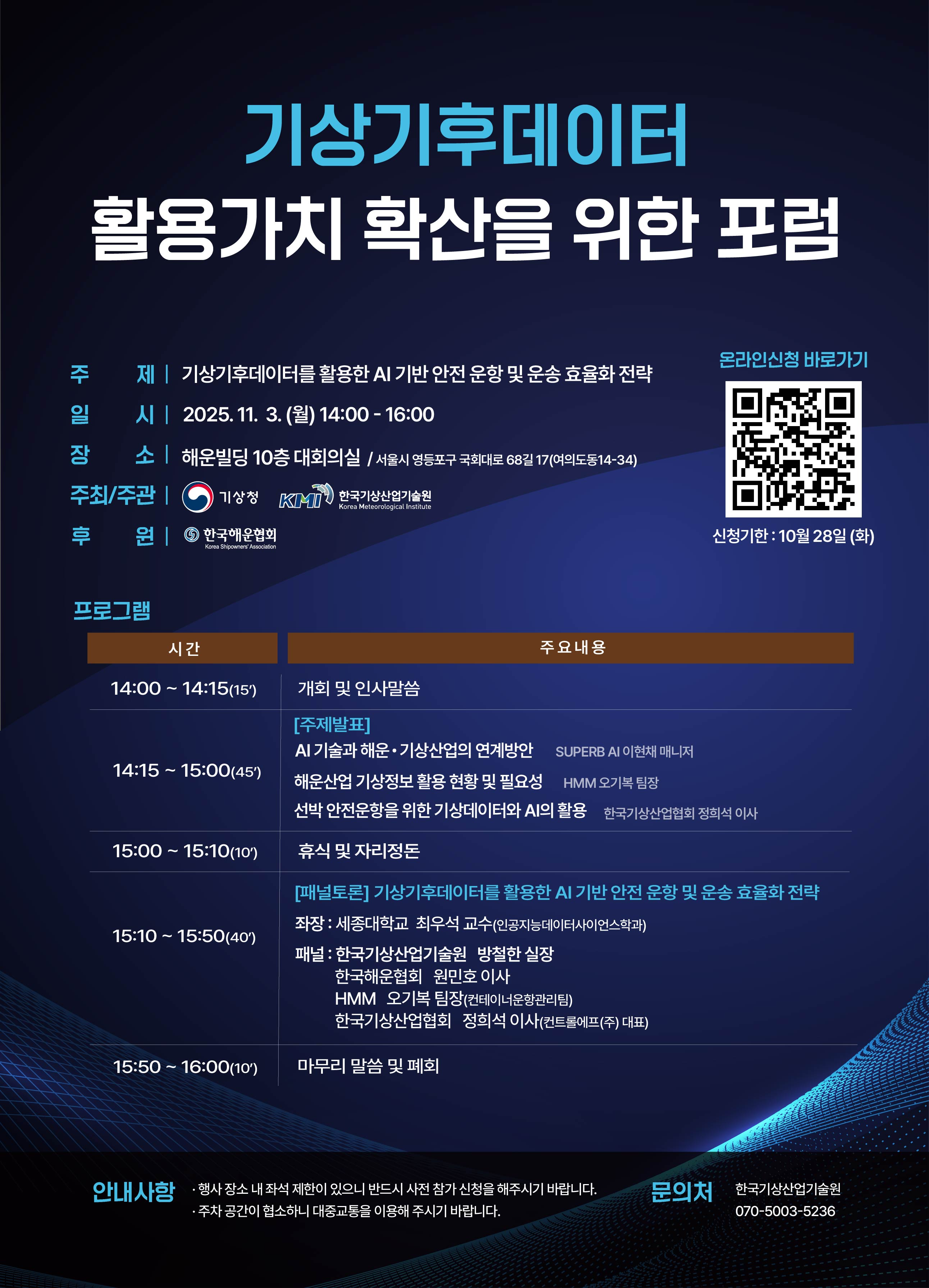 『기상기후데이터 활용가치 확산을 위한 포럼(해운산업)이 개최됩니다.