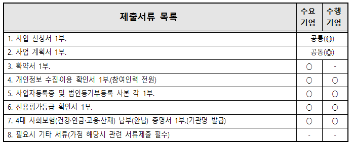 ** 제출서류 작성 관련 양식은 ‘사업안내서’ 별지 서식 참조